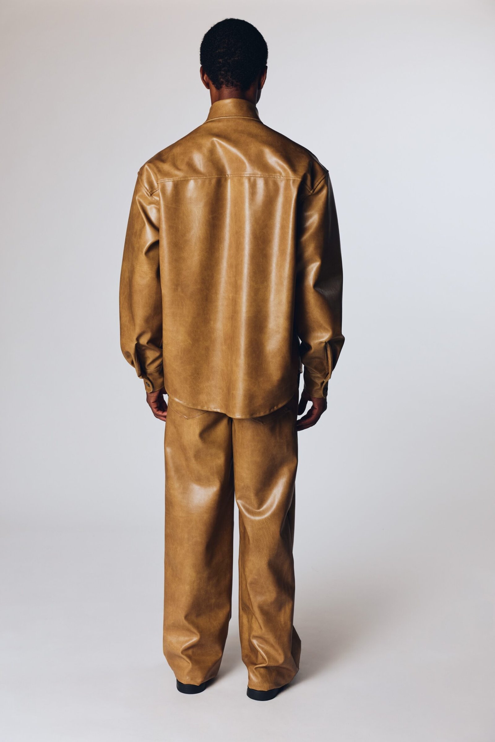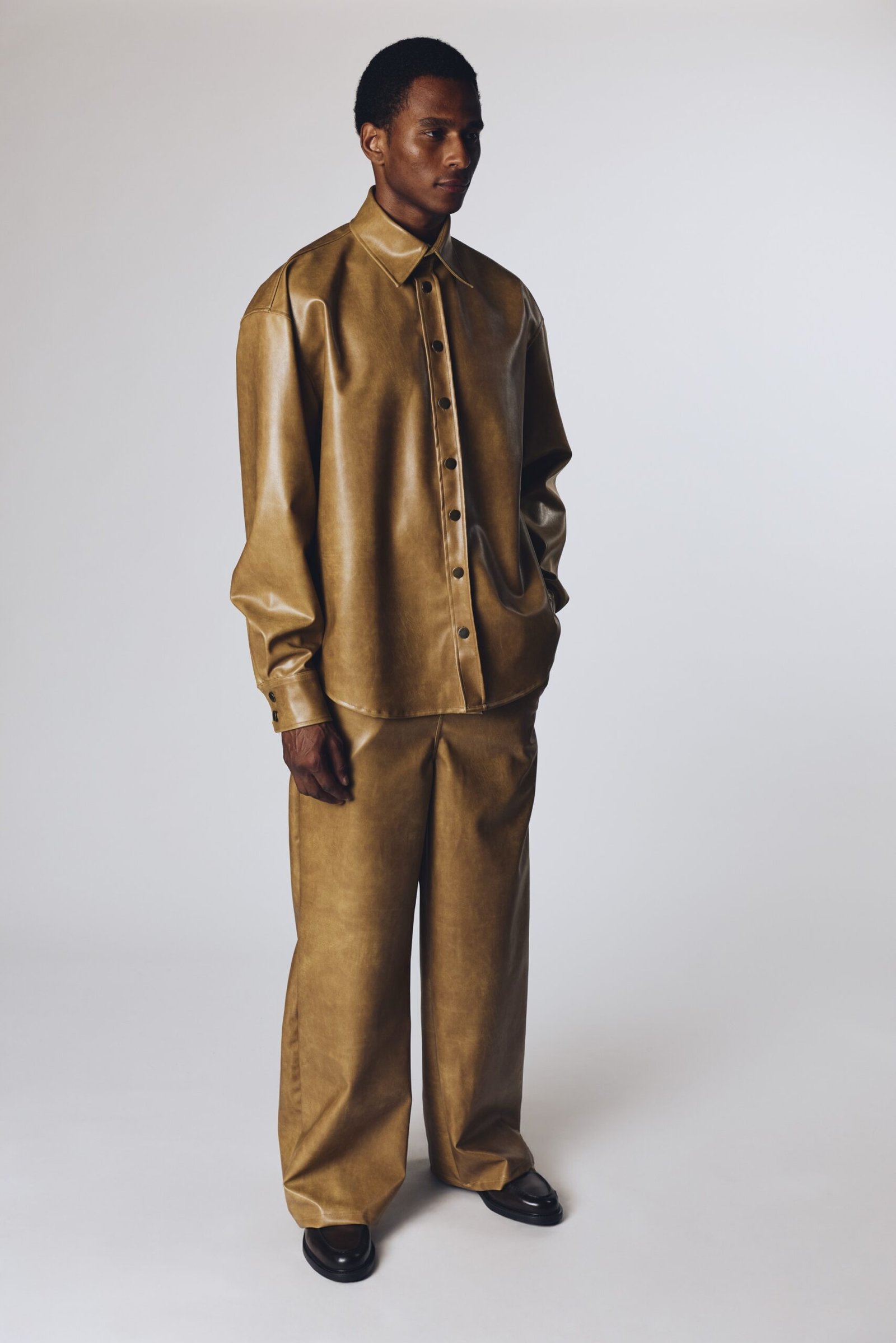Antik düğme detaylı, geniş yakalı, uzun kollu kahverengi deri gömlek. Elisio (model) 1.89 boyunda, S-M giyiyor.