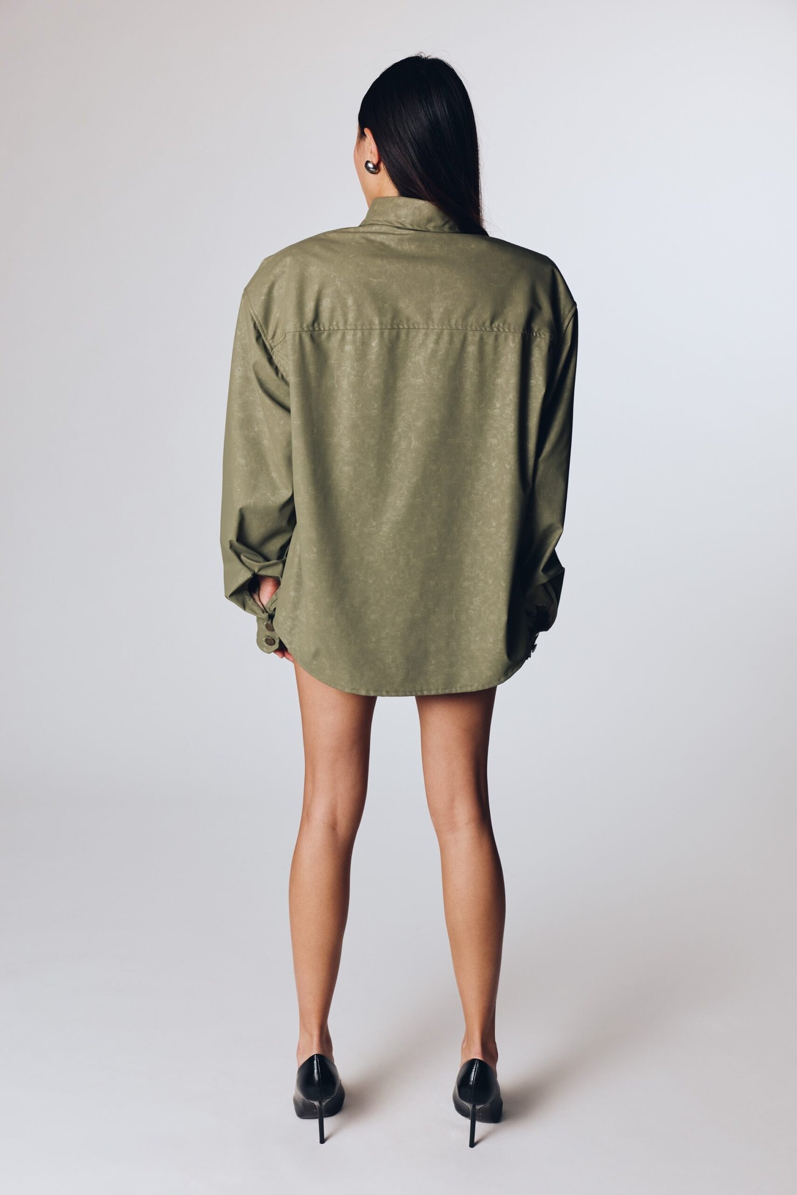 Oversize yeşil deri uzun kollu, antik düğme detaylı gömlek. Federica (Model) 174 boyunda, S-M giyiyor.