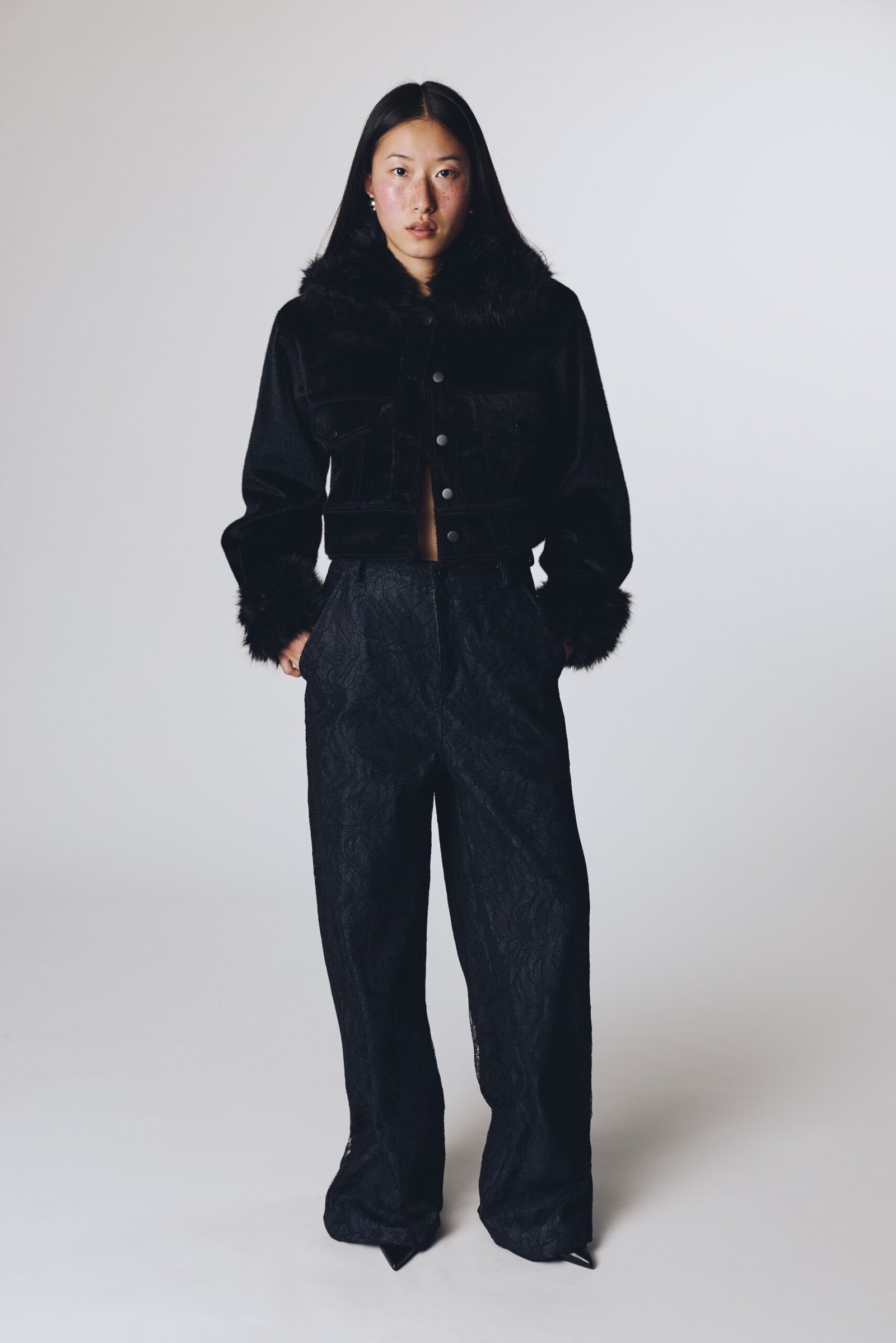 Denim kumaş üzeri siyah dantel kaplamalı pantolon. Federica (model) 174 boyunda, S giyiyor.