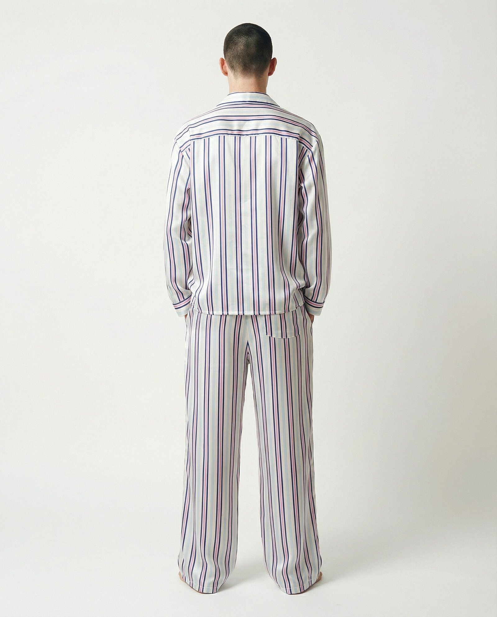 Mavi ve pembe çizgi detaylı, oversize kesim, beli lastikli, arka cep detaylı, asetat saten pantolon. Davide (Model) Boy 186, L-XL giyiyor.