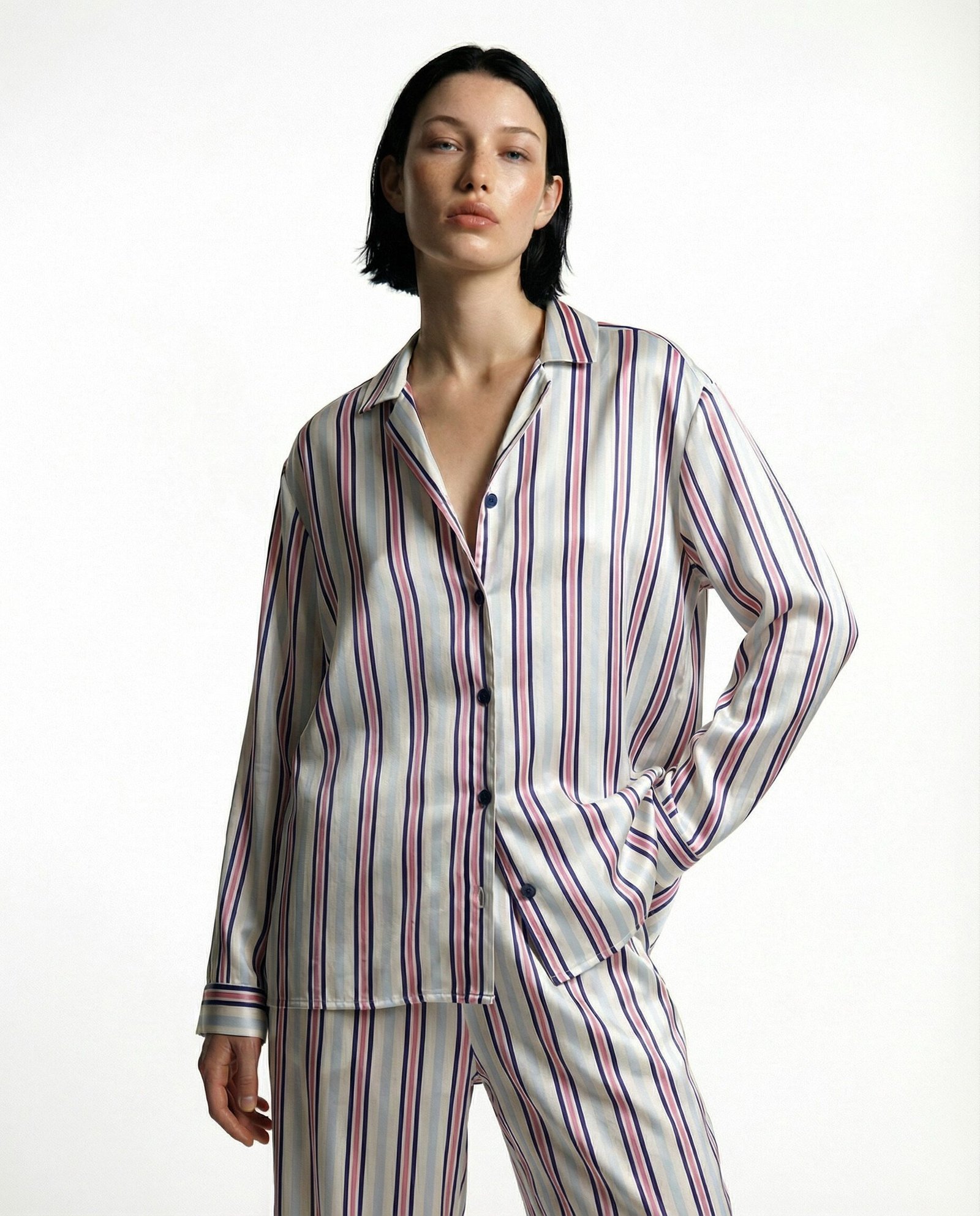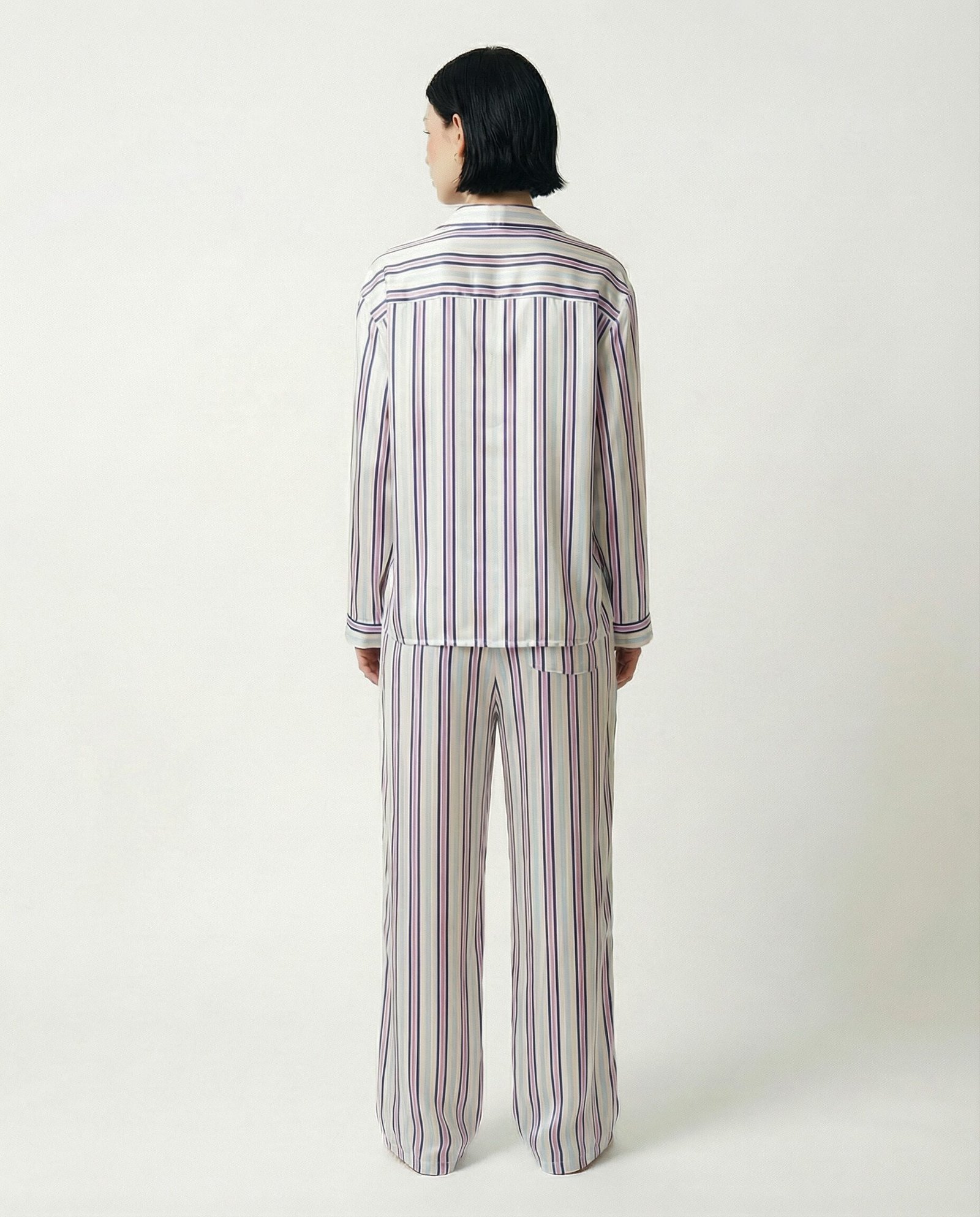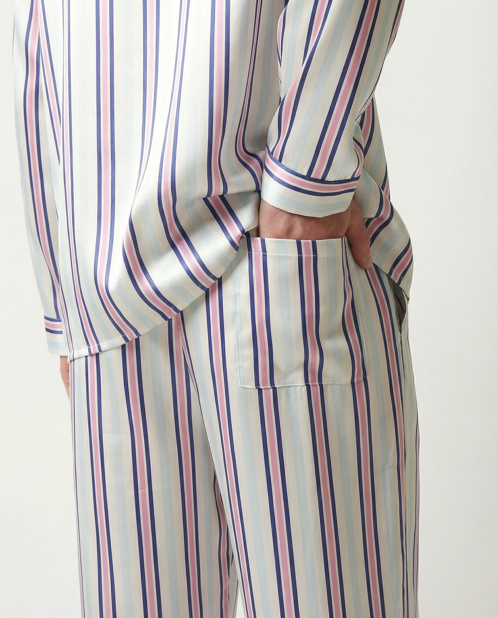 Mavi ve pembe çizgi detaylı, oversize kesim, beli lastikli, arka cep detaylı, asetat saten pantolon. Alexa (Model) Boy 174, S-M giyiyor.