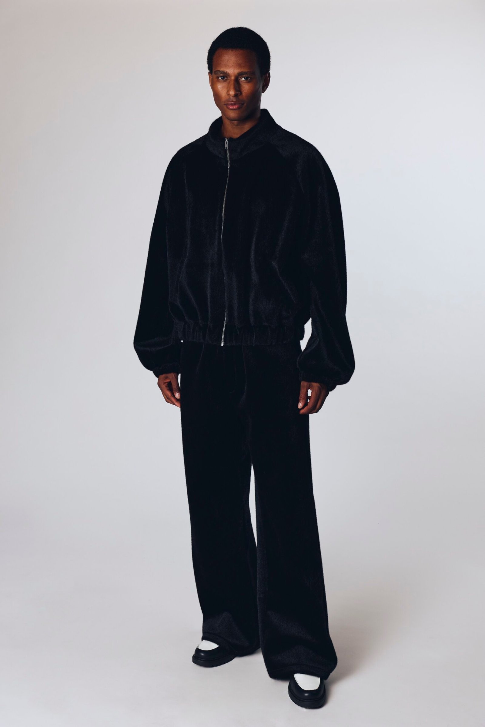 Metal fermuar detaylı, manşet ve beli lastik detaylı, oversize siyah kısa tüylü kürk eşofman üstü. Federica (model) 174 boyunda, S-M giyiyor. Elisio (model) 1.89 boyunda, S-M giyiyor.